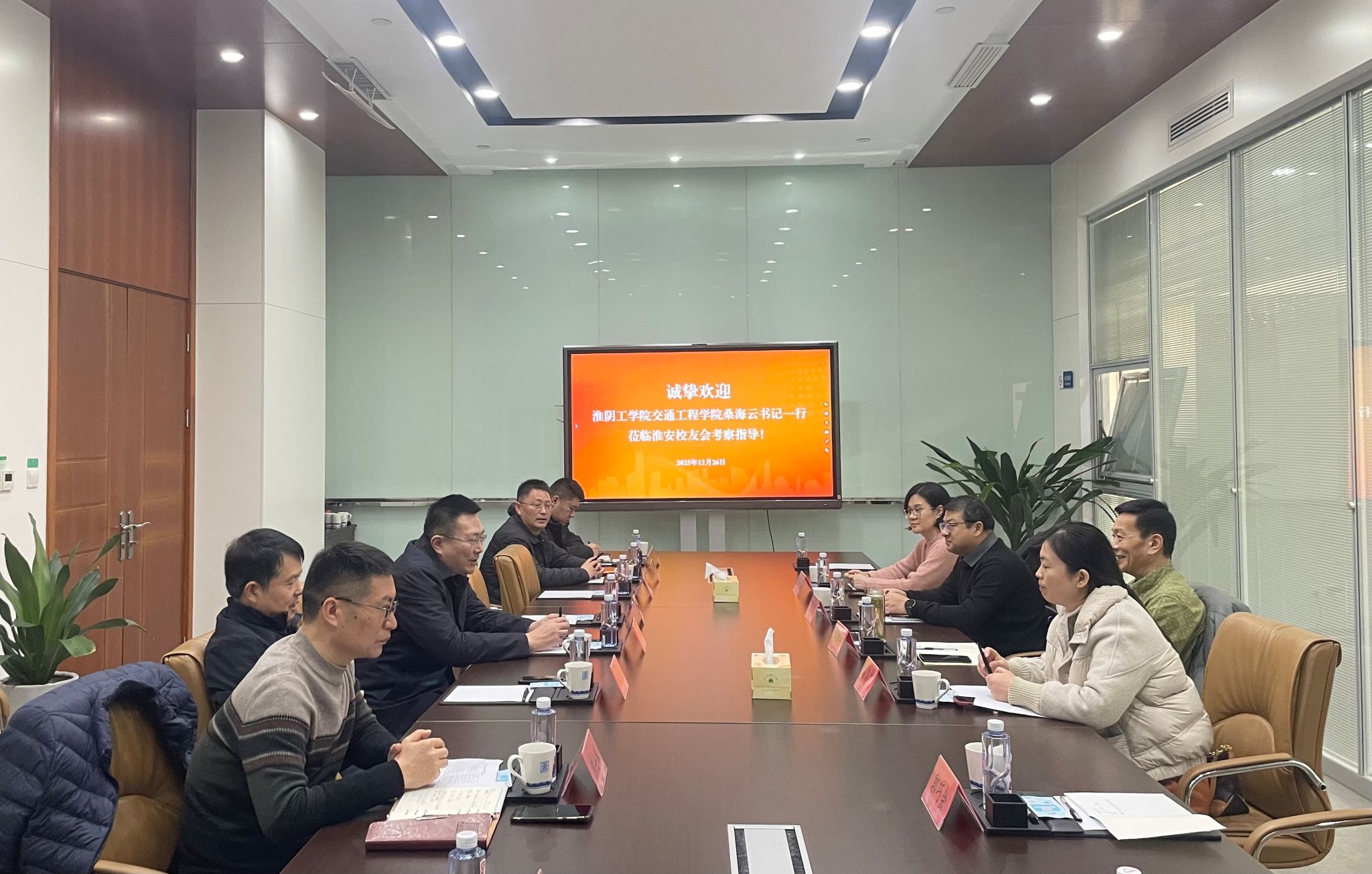 12月26日下午,校友总会秘书长、对外联络与合作处处长胡建民、交通学院党委书记桑海云、副书记、副院长钱国庆、交通学院学工办主任韩笑一行在江苏美城建筑规划设计院有限公司与江苏淮安校友会开展交流座谈。淮安校友会会长曹明拓、副会长邹云良和王金元、理事刁明宝、秘书长陈士军、秘书刘敏等校友热情接待了母校一行。